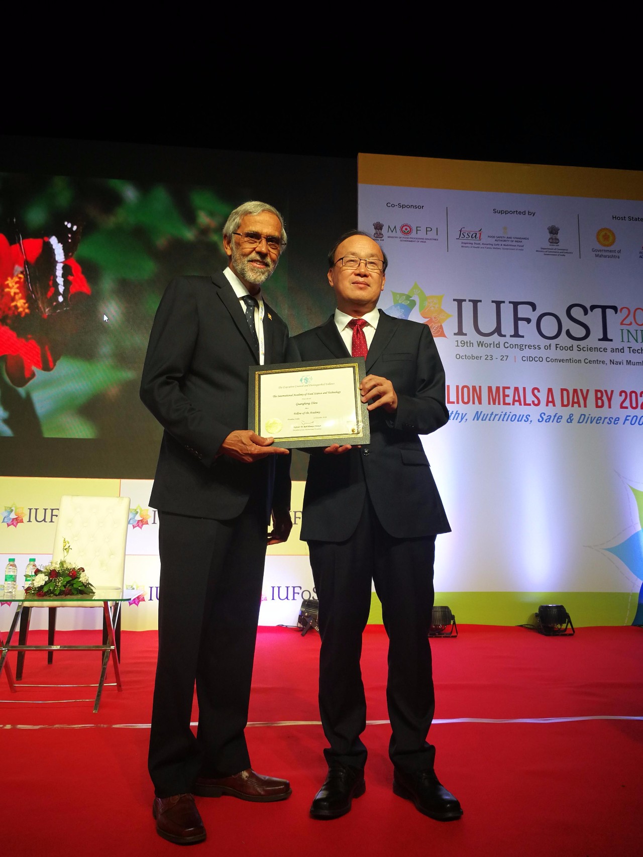 2018年10月24-27日,第十九届世界食品科技大会在印度孟买召开。会议期间,国际食品科学院(IAFoST) 隆重举办了2018年新晋院士颁奖典礼,国际食品科学院执行主席、美国加州大学戴维斯分校Paul Singh教授为周光宏教授颁发院士证书。