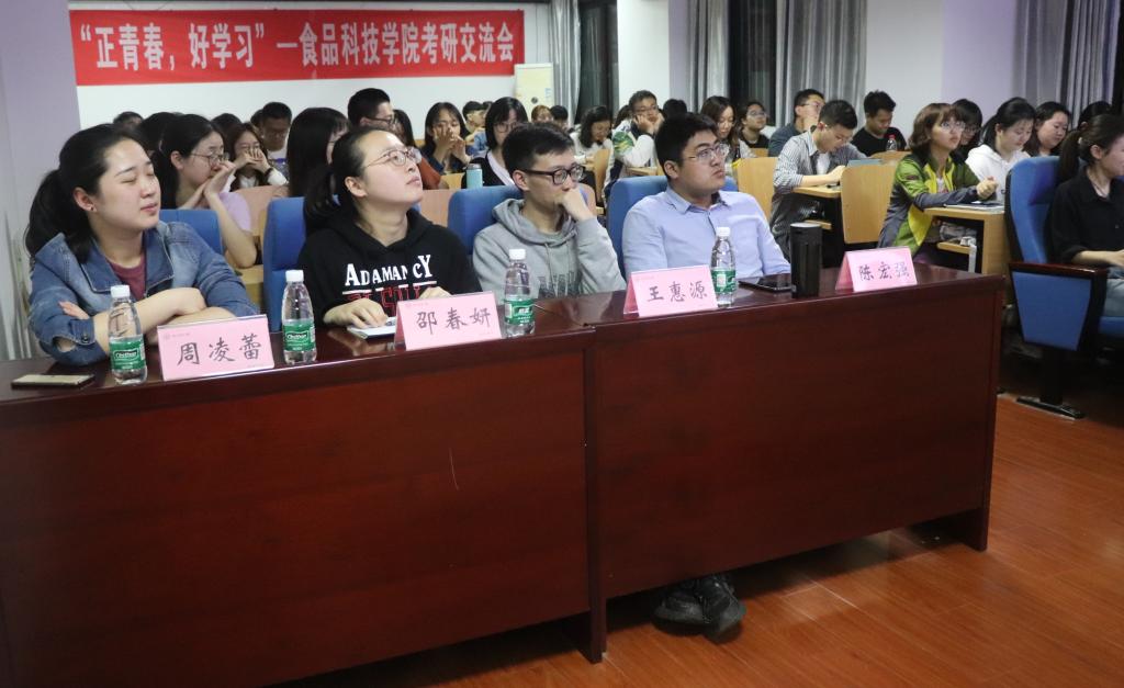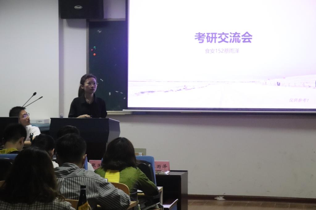 4月24日晚,食品院在院楼213举办了“正青春,好学习”主题考研交流会。本科生辅导员陈宏强、周凌蕾、邵春妍和王惠源出席本次交流会,优秀学生代表张国伟、冯骁、蔡雨泽分享了考研经验。