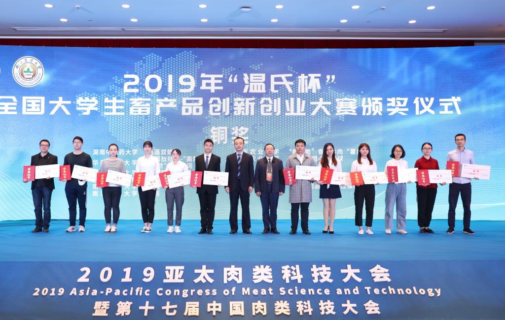 10月12日上午,“温氏杯”全国大学生畜产品创新创业大赛决赛颁奖典礼在南京国际会议中心举办的亚太肉类科技大会上举行。农业农村部畜牧兽医局副局长王俊勋、中国畜产品加工研究会会长周光宏教授、温氏股份养禽事业部副总裁秦开田、荷兰马斯特里赫特大学教授Mark Post、中国畜产品加工研究会名誉副会长李洪军教授、农业农村部屠宰技术中心副处长高胜普、中国畜产品加工研究会副会长、杭州艾博科技工程有限公司董事长韩青荣和平遥牛肉集团董事长雷秉义等人应邀出席本次颁奖典礼并为获奖者颁奖。颁奖典礼由pp电子官方网站pp电子官方网站党委副书记邵士昌主持。
