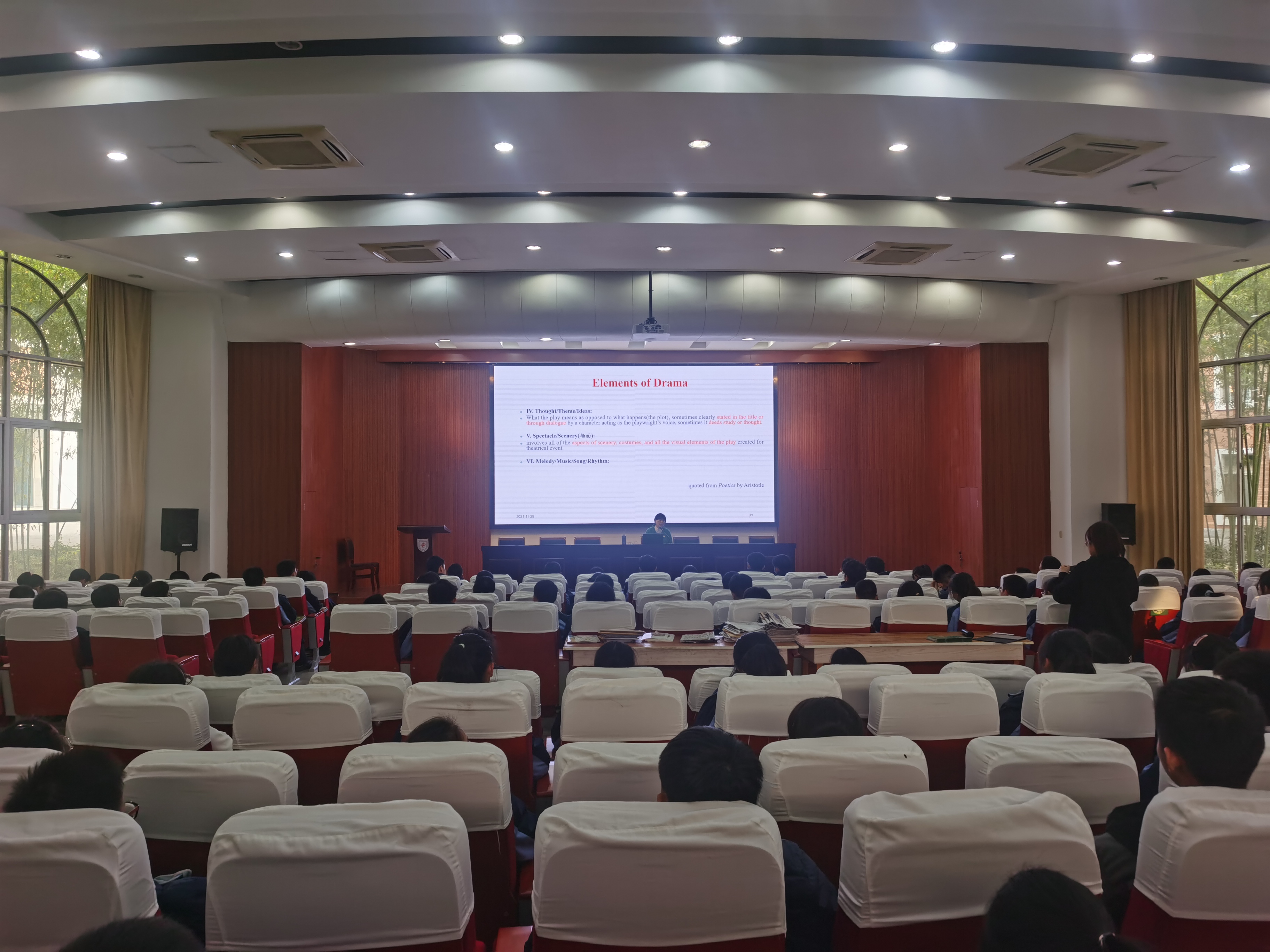 随后,董红梅以“西方戏剧赏析”为主题为同学们开展了一堂文化底蕴丰富的专题讲座,向同学们详细介绍了戏剧的种类、要素,并针对西方戏剧著作及著名戏剧家进行了详细介绍。讲座过程中同学们积极踊跃地提问,表示出对于西方戏剧的浓厚兴趣。