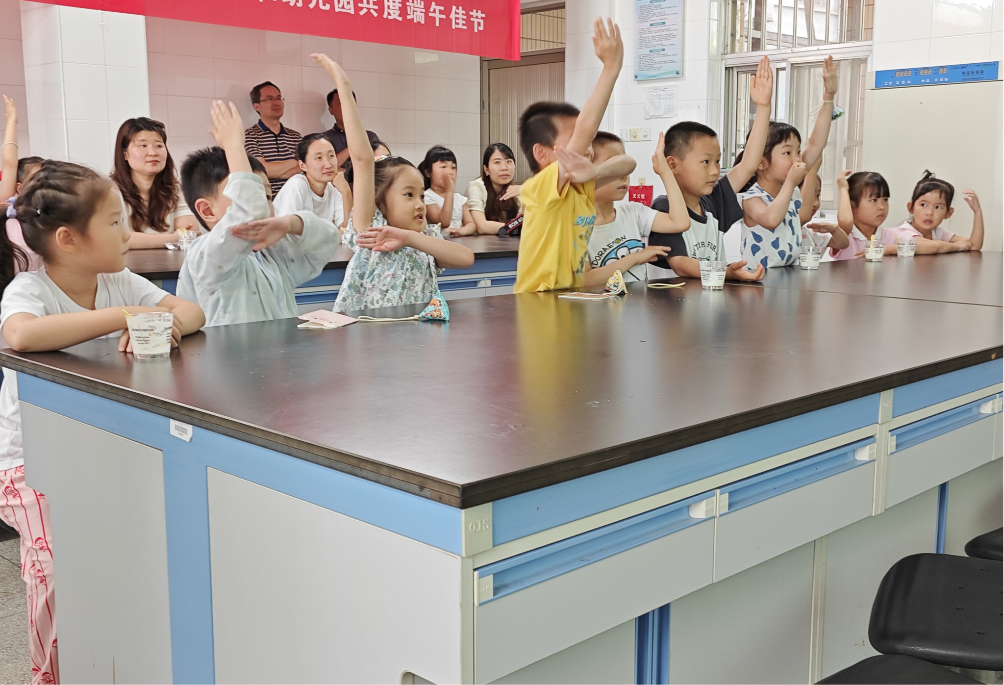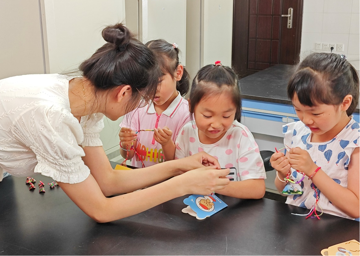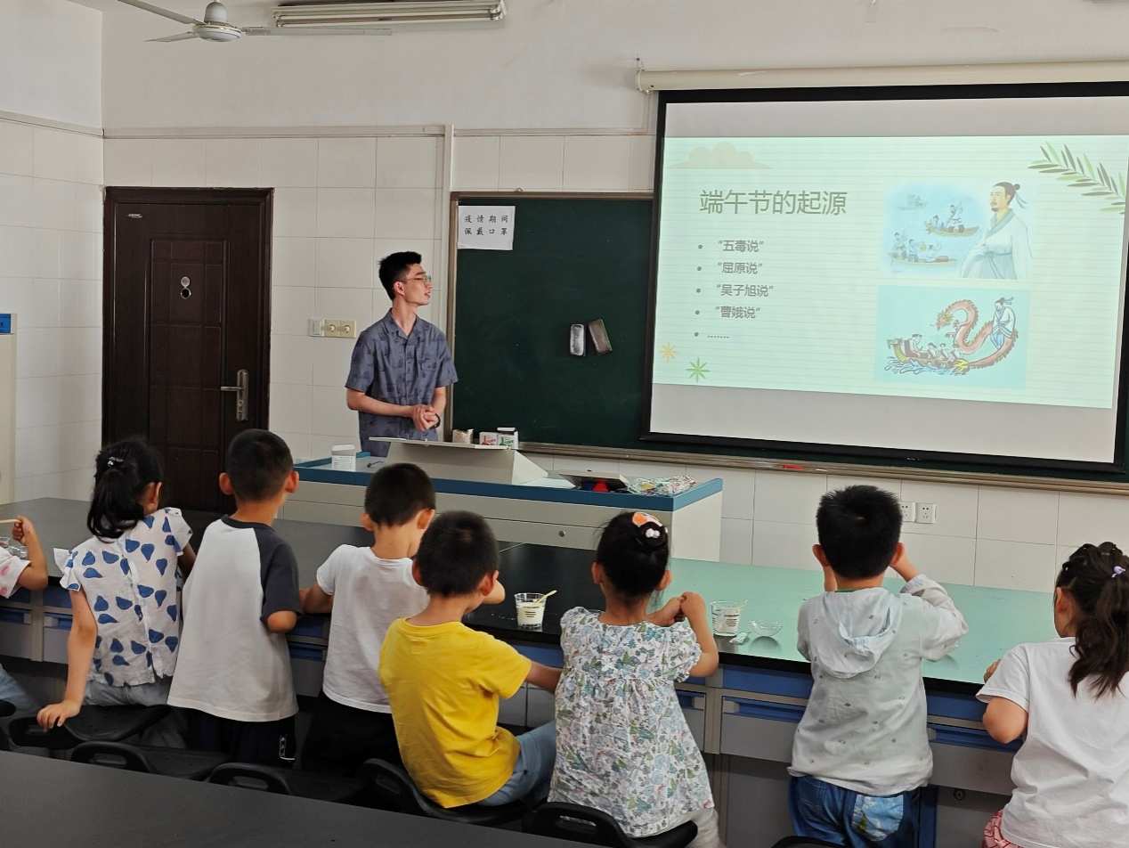 硕士生党员通过PPT展示及讲解向小朋友们介绍了端午节的历史渊源、民间传说、风俗习惯和各地美食等内容,让小朋友们对端午节有了更深入的了解和认识。现场还有端午节的知识问答和游戏互动环节,小朋友们积极举手回答问题,并自己动手穿五彩绳,为自己戴上端午驱蚊五彩手环。