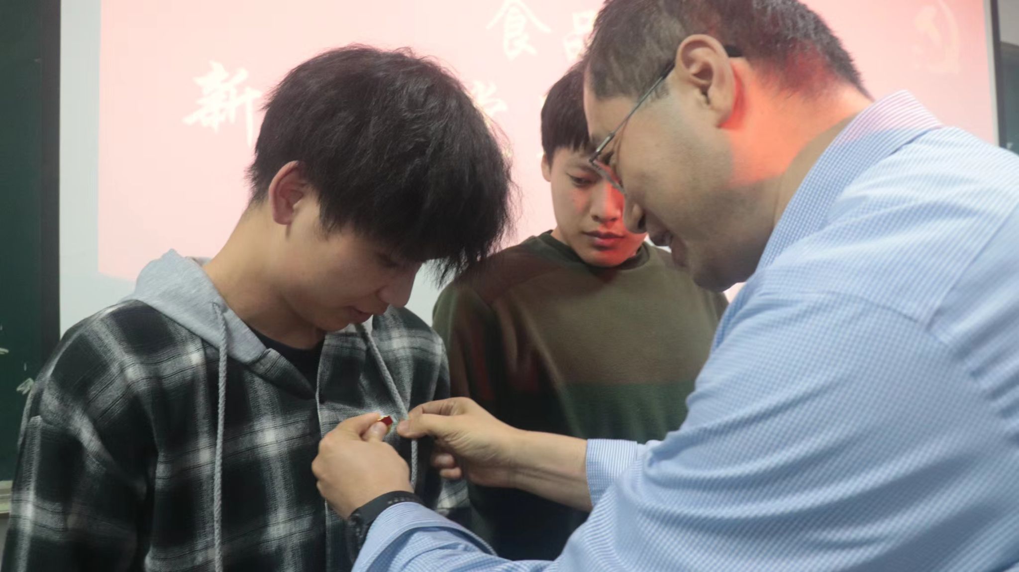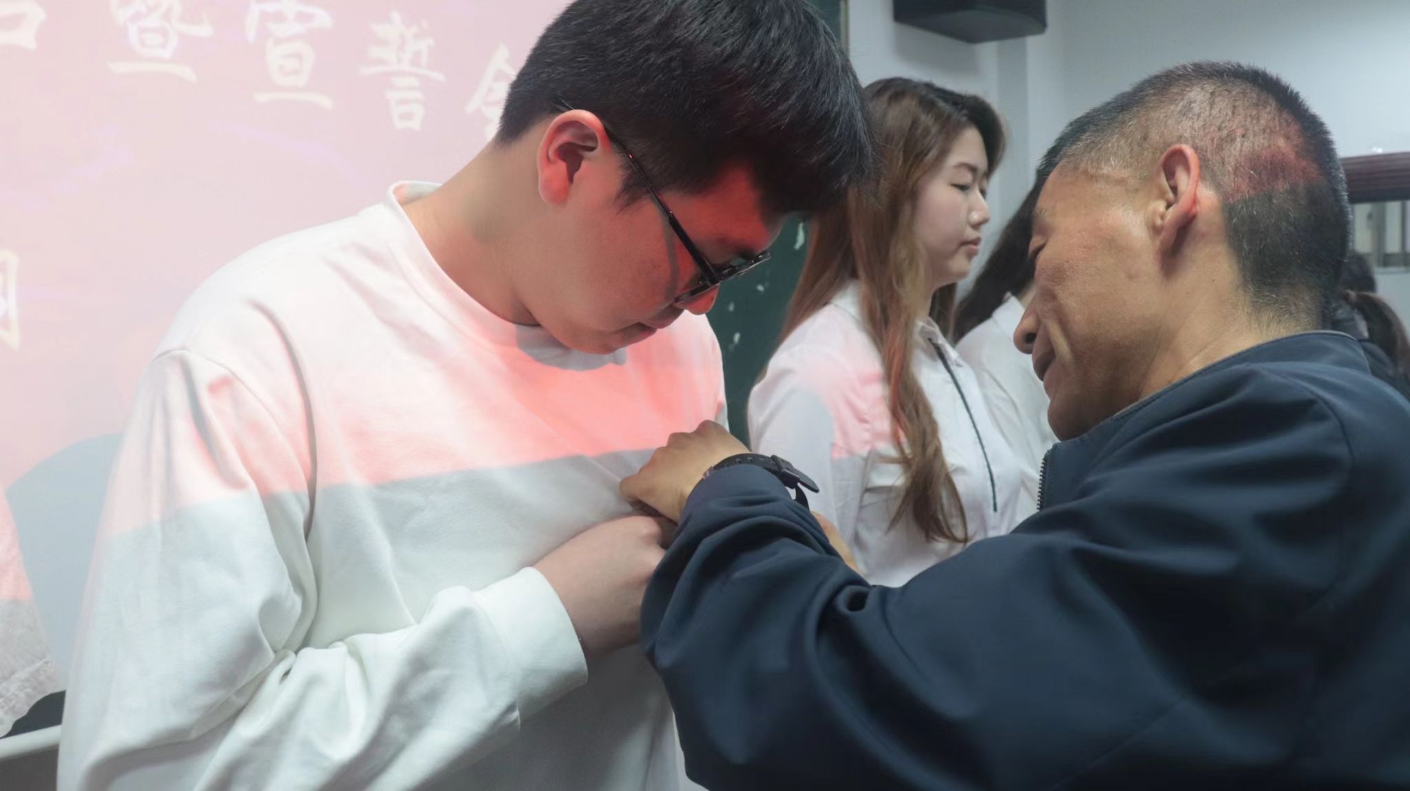 仪式上,孙健、狄传华为新发展党员代表佩戴党徽,传递党员的责任和使命。