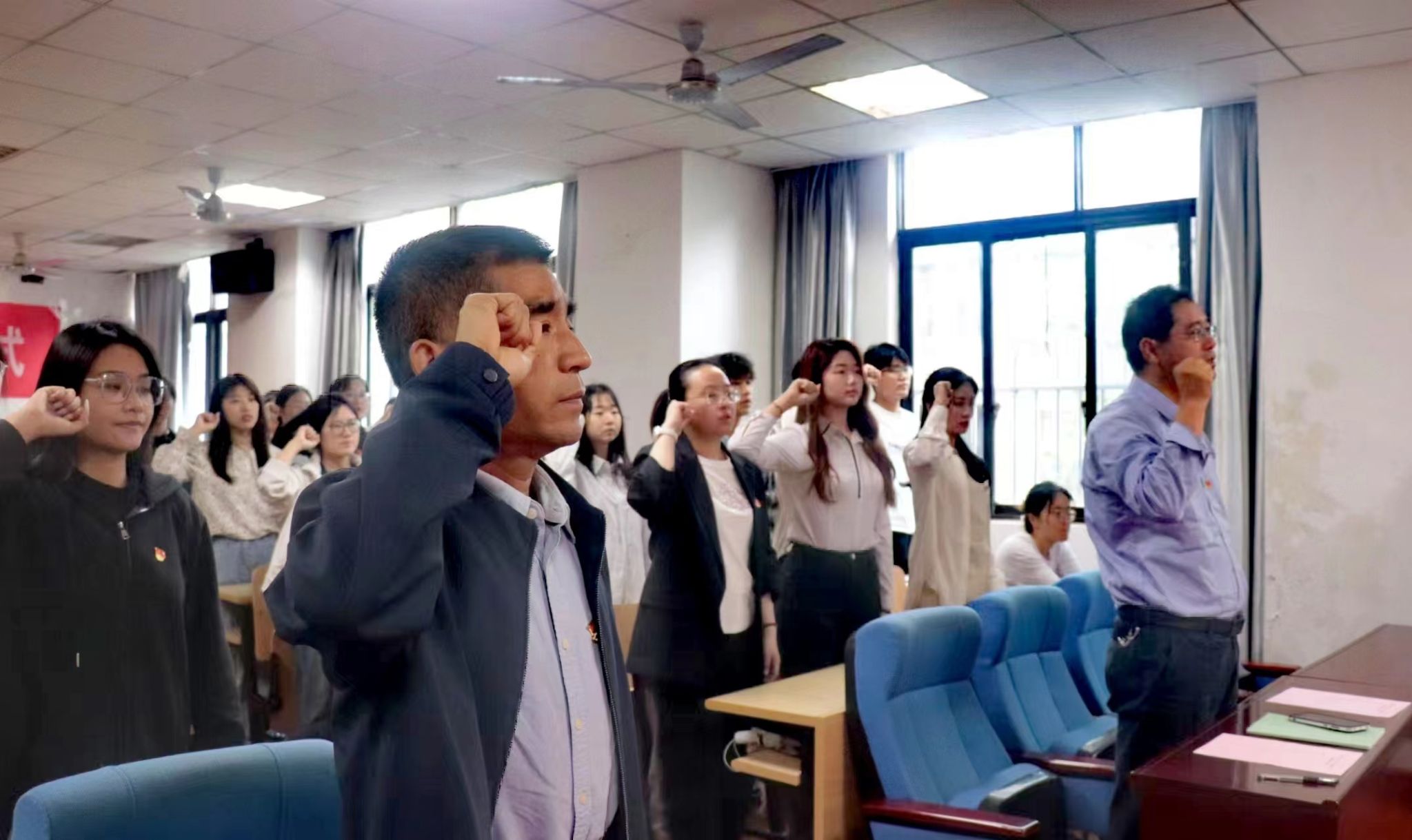 活动在庄严的国歌声中拉开帷幕。孙健带领全体新发展党员面向党旗庄严宣誓,面向党旗,举起右拳宣誓,向党和人民许下铮铮誓言和庄严承诺。