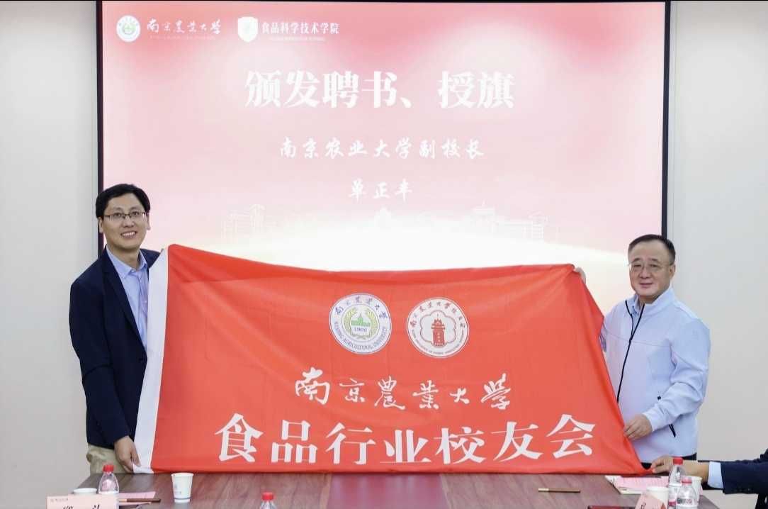 在庄重的音乐声中,pp电子官方网站副校长单正丰为第二届理事会会长、副会长颁发聘书,并举行了隆重的授旗仪式。鲜红的会旗象征着使命的传递与责任的延续,标志着食品行业校友会正式开启新的征程。
