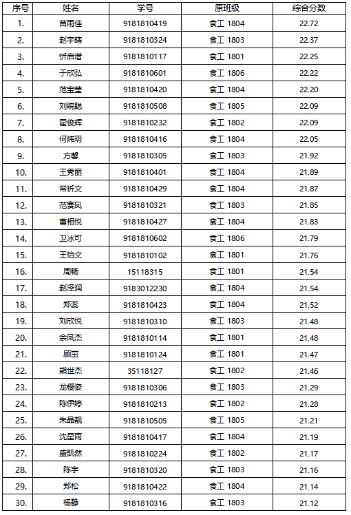 根据《2018 级“复合应用型”食品科学与工程卓越农林人才培养计划选拔方案》和《pp电子官方网站 2018 级大类招生专业分流实施办法》,经相应的考核程序,拟录取 30 名同学入选 2018 级“复合应用型” 食品科学与工程(卓越班),现将名单予以公示。