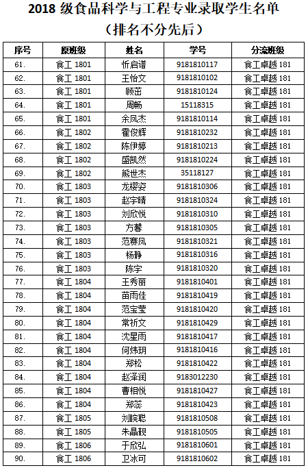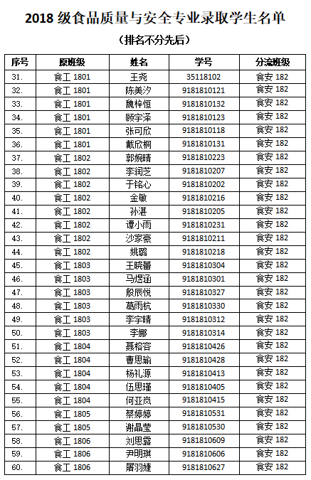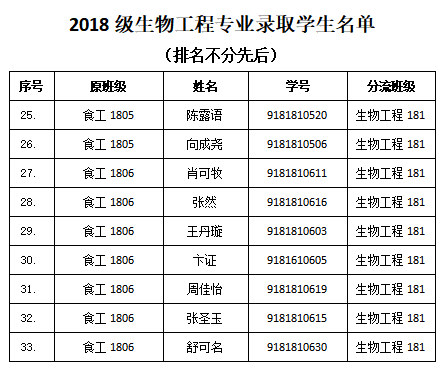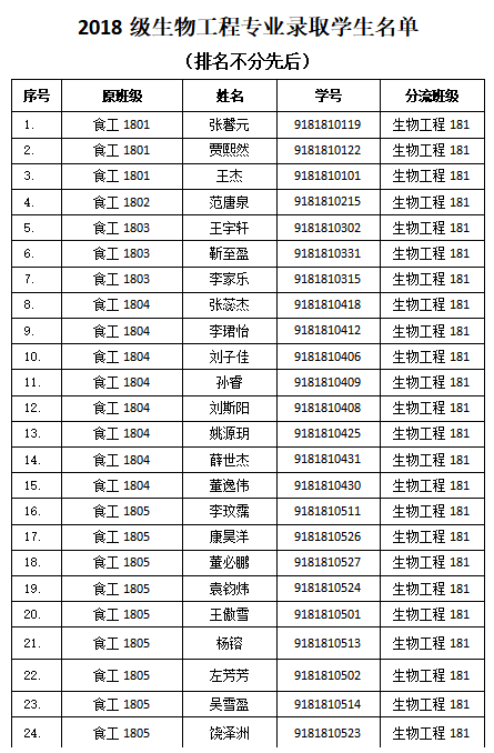 依据《pp电子官方网站2018级本科大类招生专业分流实施方案》和《pp电子官方网站2018级本科大类招生专业分流工作计划》,学院开展了2018级食品科学与工程大类专业分流工作,各专业录取人数如下:食品科学与工程专业录取90人、生物工程专业录取33人、食品质量与安全专业录取60人,现将录取学生名单予以公示,详细名单见附件。