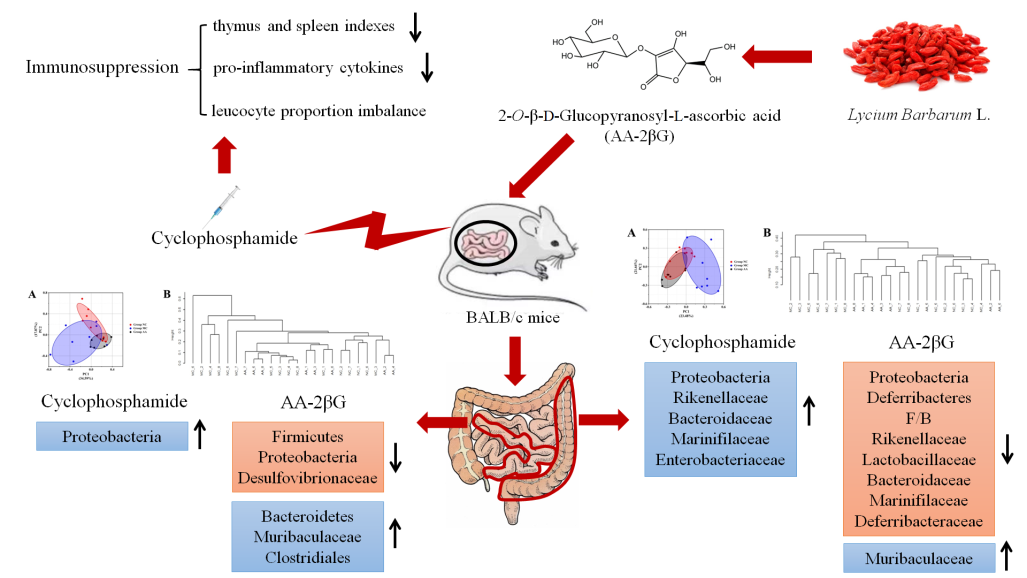 本研究采用环磷酰胺(Cy)诱导免疫抑制小鼠模型对AA-2bG的免疫调节作用及其潜在机制进行研究,研究发现AA-2bG可以显著改善Cy引起的机体基本免疫指标变化;同时AA-2bG可以调节小鼠小肠和结肠菌群的结构和组成,显著逆转Cy造成的Proteobacteria、Muribaculaceae等微生物相对丰度的改变。
