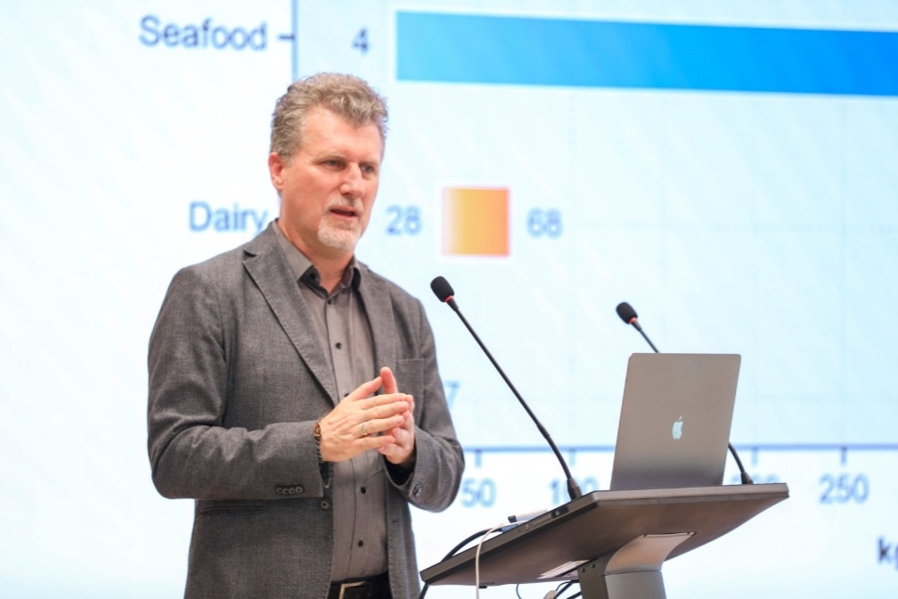 讲座伊始,Raffaele Mezzenga教授以详实的数据和生动的案例,揭示了食物蛋白质浪费对环境的巨大影响。他指出,每浪费1千克食物蛋白质,就会产生15至750千克的二氧化碳排放,这种惊人的碳足迹不仅加剧了气候变化,还对氮磷循环、全球淡水资源利用等多个方面产生了深远影响,引起了在场师生的广泛关注和深刻思考。