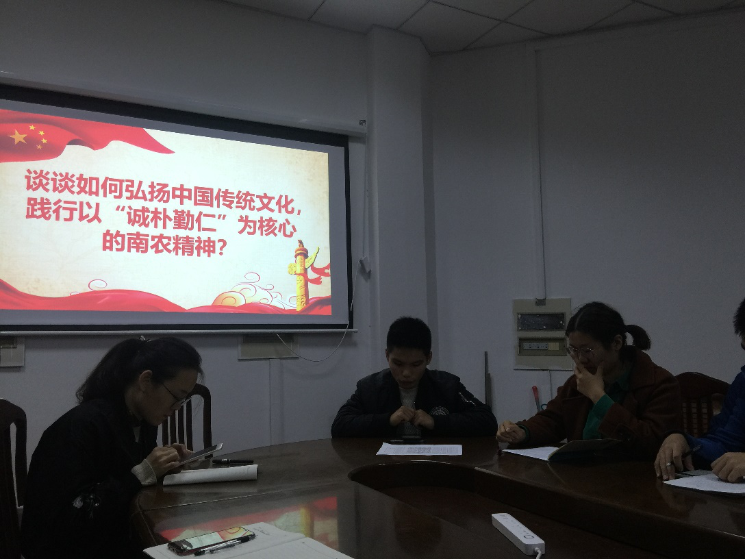 在讨论会上,大家就“如何弘扬中国传统文化,践行以‘诚朴勤仁’为核心的南农精神”进行了主题交流讨论。苏宏萌同志表示,作为文化弘扬的积极践行者,我们要完善自身,切实做到勤学、修德、明辨、笃实。崔智勇同志表示,作为当代青年党员,不仅仅需要保质保量完成自身的学业,还应该带领广大青年学子弘扬优秀的中华传统文化、传承南农精神,做到“发动先进的,鼓励积极的,培养最广大的”,让弘扬中华传统文化的活动成为覆盖学院、辐射全校的精神领航项目。