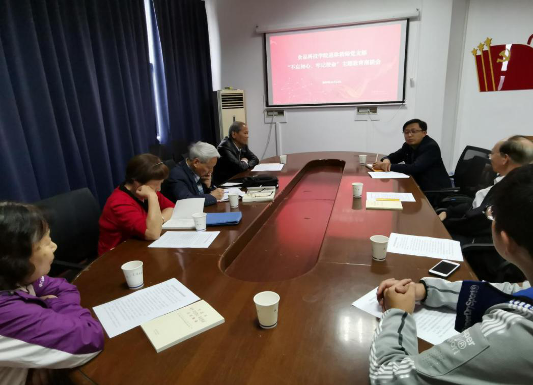10月14日下午,pp电子官方网站pp电子官方网站离退休教师党支部在食品院党员活动室举办“不忘初心、牢记使命”主题教育学习会。学院党委书记朱筱玉出席了座谈会,支部六位退休党员参加此次活动。座谈会由学院离退休党支部书记江汉湖教授主持。