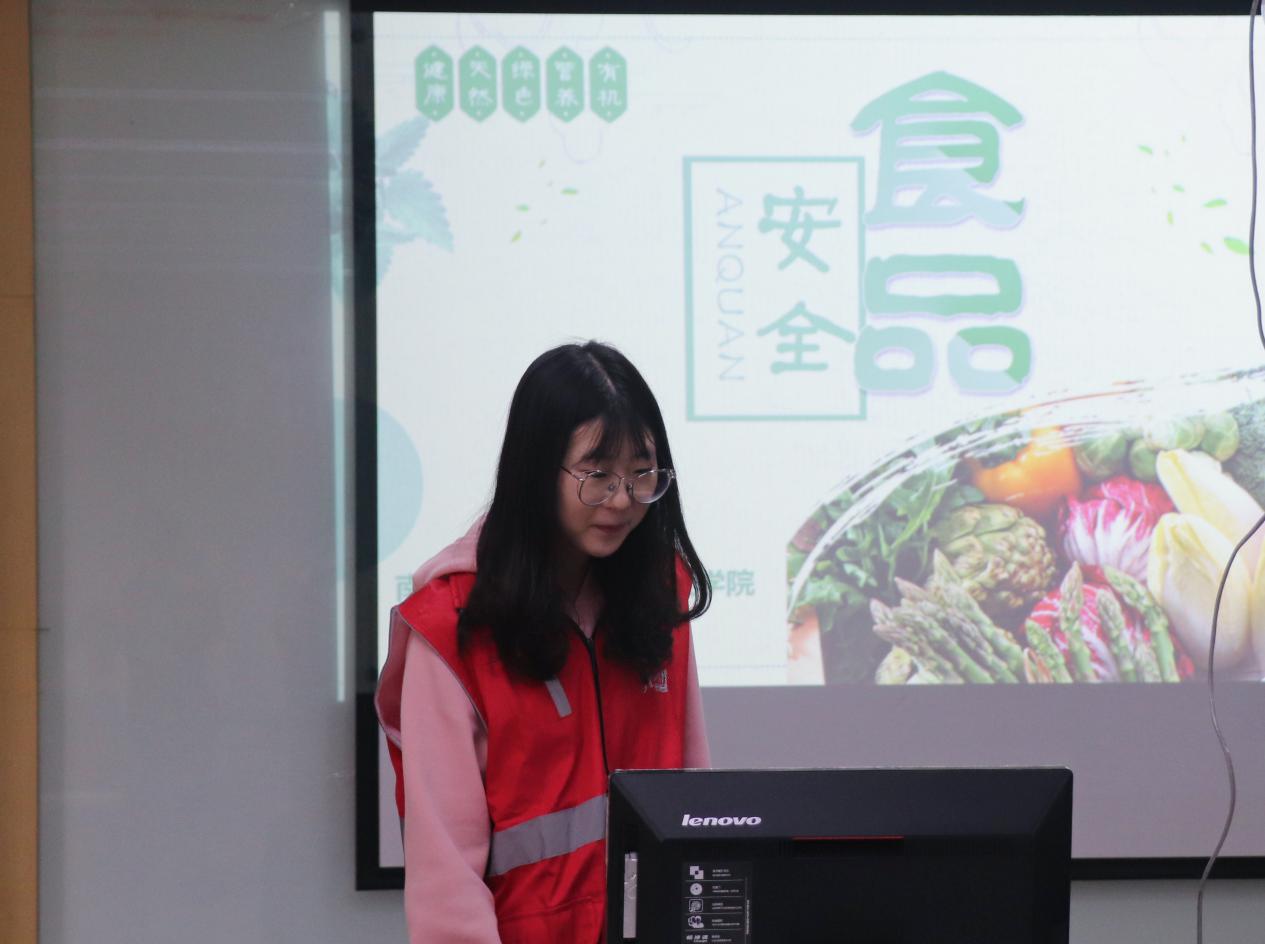 随后,支部代表付雨萌通过PPT讲解和问答互动的形式,向社区居民介绍时下市场肉制品、现制现售食品和鲜切果蔬的卫生安全保鲜现状及存在的问题,并为社区居民介绍合理采买果蔬肉蛋、食品保鲜技巧,同时对“食物相克”等问题进行解读,引导广大市民走出误区。最后采用有奖竞答的形式,帮助参加活动的居民朋友巩固食品安全知识。