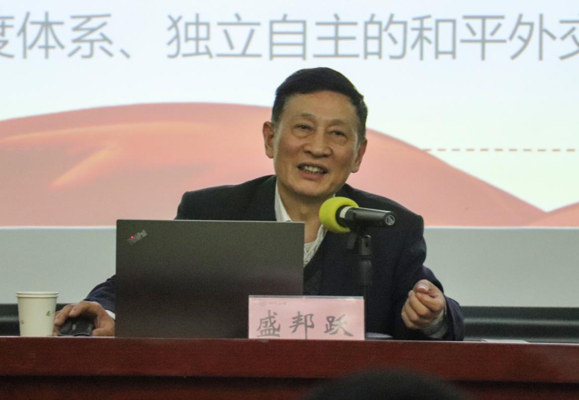 随后,盛邦跃从“中国特色社会主义总任务”、“中国特色社会主义总目标”、“新时代我国社会主要矛盾”、“中国特色大国外交”、“中国特色社会主义事业的新布局”与“中国特色社会主义的本质特征和制度”六个角度加以佐述,深刻阐释了习近平新时代中国特色社会主义思想的理论精髓。