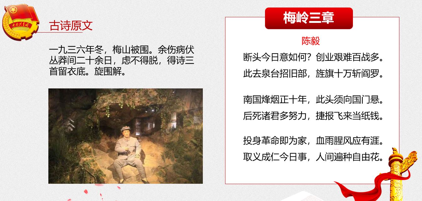 习近平总书记强调:“学习党史、国史,是我们坚持和发展中国特色社会主义、把党和国家各项事业继续推向前进的必修课。”《梅岭三章》是共产党人革命者生死观、价值观、人生观的体现,对我们树立共产主义理想信念、面对社会新的挑战有着很好的借鉴作用,激励我们用革命战争时代那股干劲,那股拼命精神,跟着党中央在中华民族复兴征程中奋勇前进!